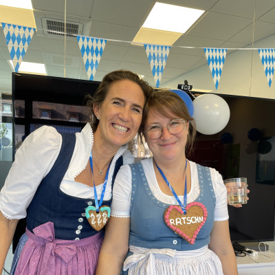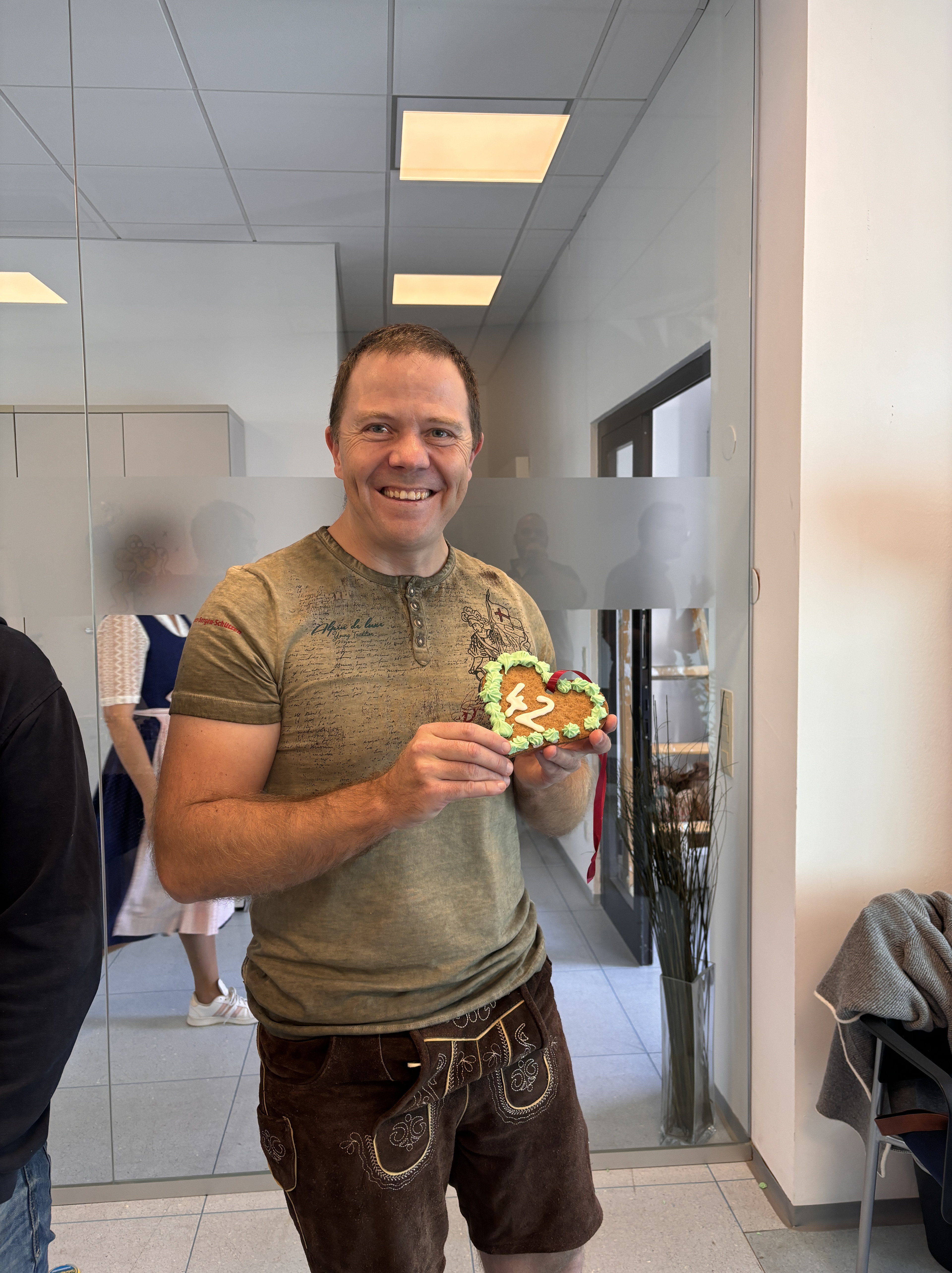 Unsere Kollegin Simone Schanitz hatte schon letztes Jahr die Idee, dass wir ein internes Oktoberfest veranstalten – und: gesagt, geplant, Mitstreiter:innen in der Vorbereitung organisiert und – getan. In der Freizeit wurden Deko, Geschirr, Getränke etc. organisiert, Lebkuchenherzen sowie Reindlinge gebacken und von unseren Damen verziert und personalisiert.